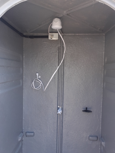 Fabricado em fibra de vidro nas seguintes medidas, Corpo com 1,05 lag. X 1,05 Prof. X 2.15 Alt, e teto com 1.15 larg. X 1.15 Prof. contendo 1 chuveiro 110 volts, tubulação de entrada de água com registro em PVC, saída de água por ralo central no piso, 1 porta sabonete, 1 porta toálha, 1 suporte para roupas, iluminação interna contendo 1 plafon (sem lâmpada) 1 interruptor, 1 tubulação elétrica para iluminação e caixa de passagem para ligação da energia, ventilação interna permanente.